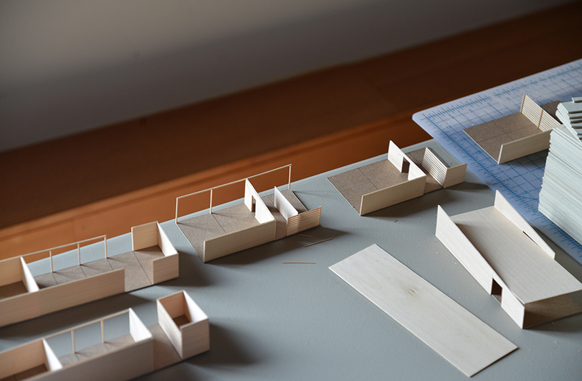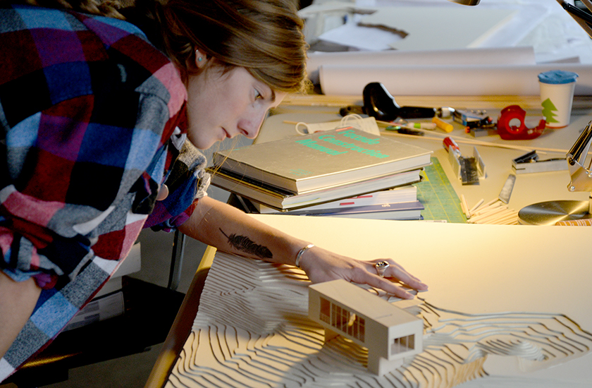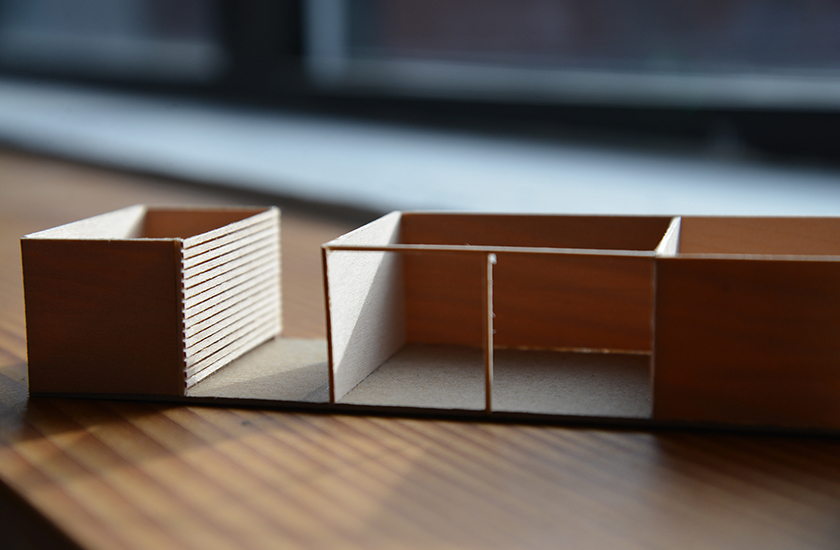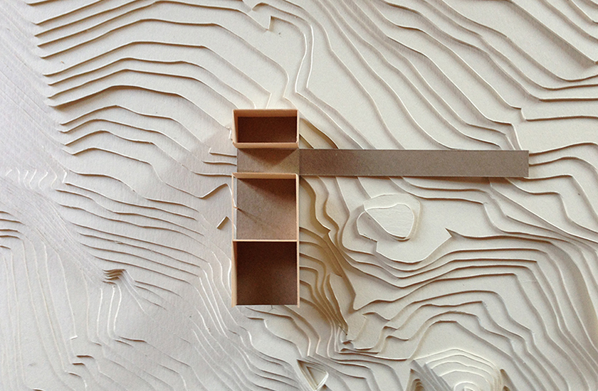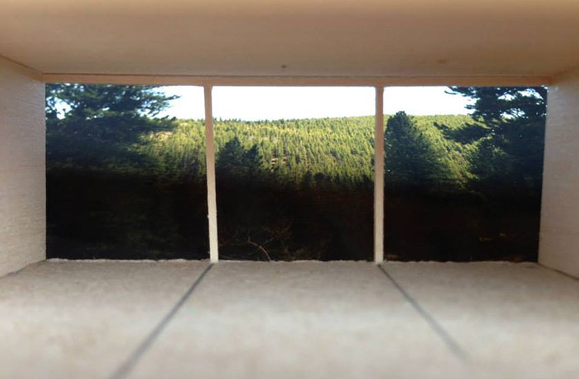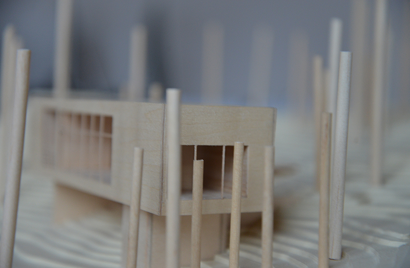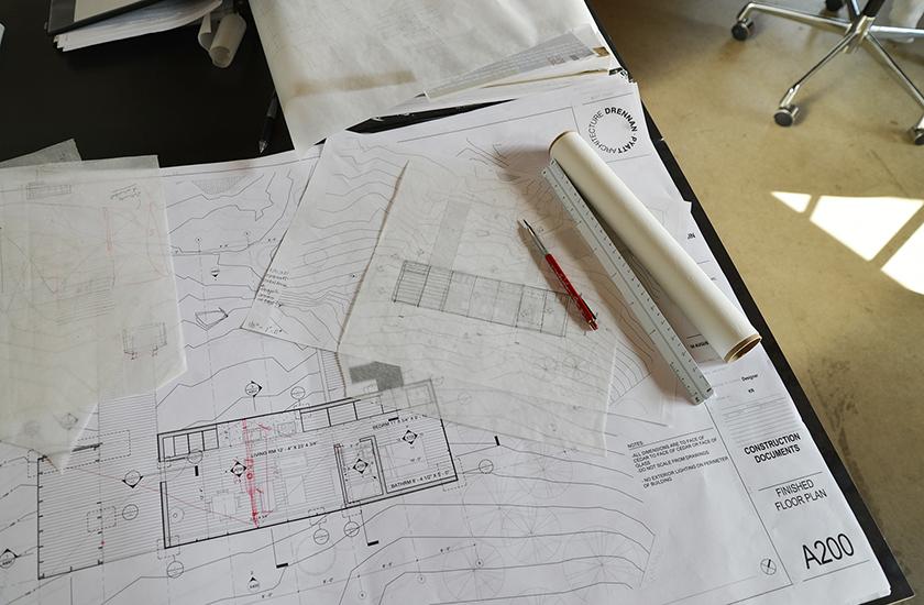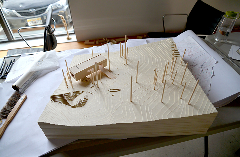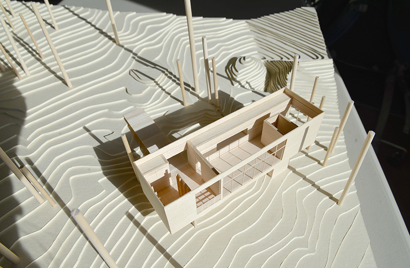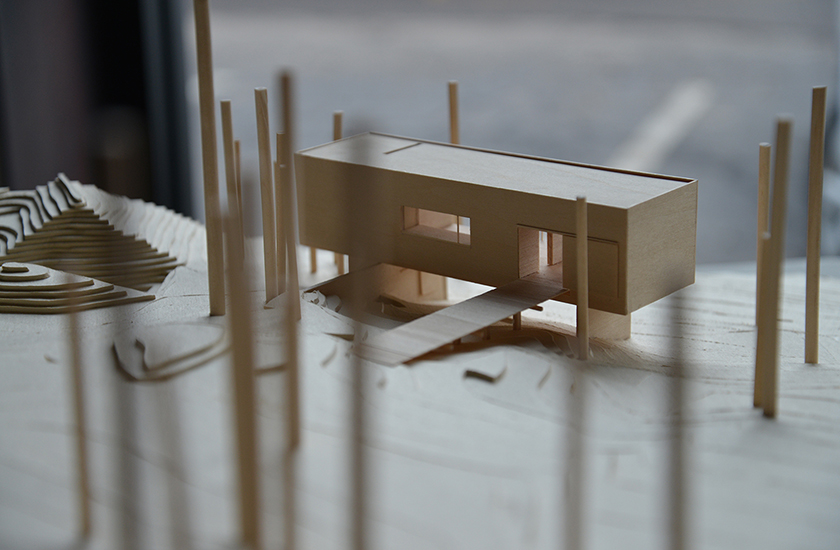 The cabin plan is simple: kitchen, utility and storage spaces run along the north wall allowing circulation to move freely alongside it. The cabin has one bedroom and one bathroom, and is divided equally between the public and private space. The entry is from a raised boardwalk that hovers just above the ground. The foundation is designed to blend with the rock outcropping allowing the house to cantilever out over the hillside.