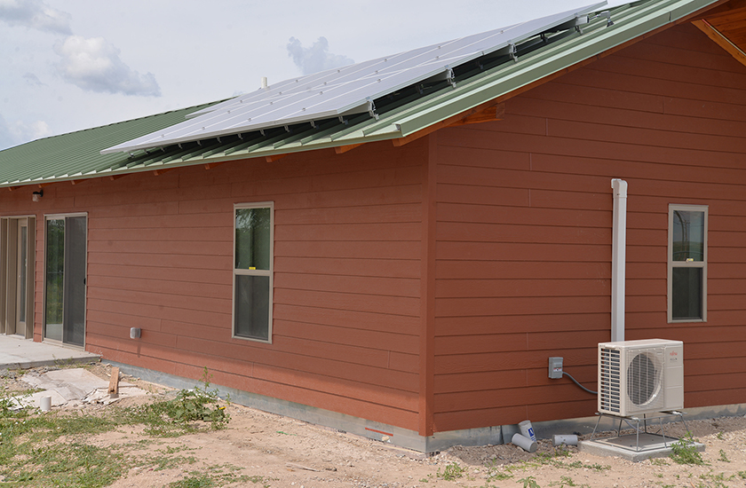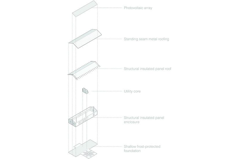 Significant importance was placed on maintaining optimal site orientation, natural daylighting, natural ventilation, and passive solar heating. The simple gable roof slopes to the south to accommodate solar panels and roof overhangs were sized for optimal summer shading. In addition, the homes are designed to achieves net-zero energy with a small photovoltaic (PV) System.