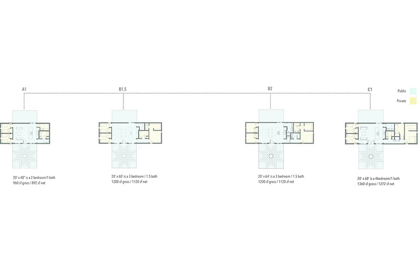 These objectives were synthesized in a series of 1, 2 and 3 bedroom floor plans organized around a large, open family room that holds the kitchen, dining and living spaces. The large open living space is separated from the bedrooms on each end. A bathroom and utility core are centralized to limit plumbing and the concrete slab foundation is specifically designed to act as thermal storage in the winter months for passive solar gain.