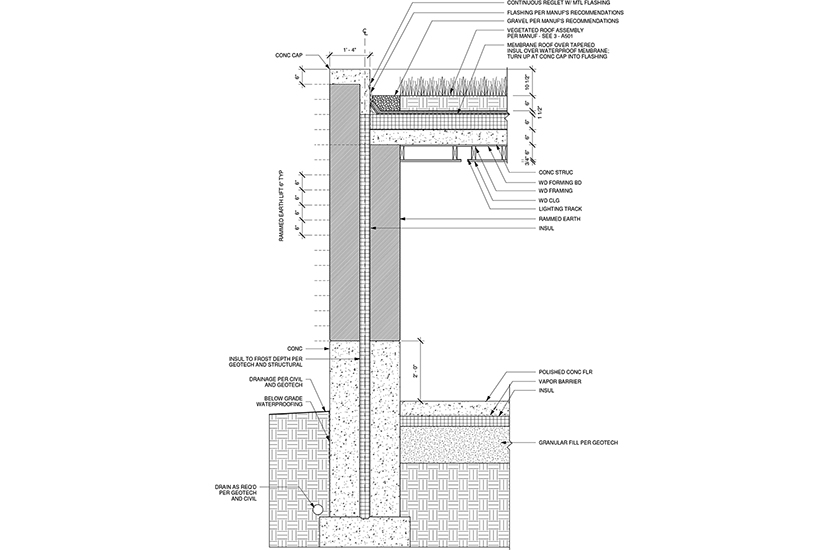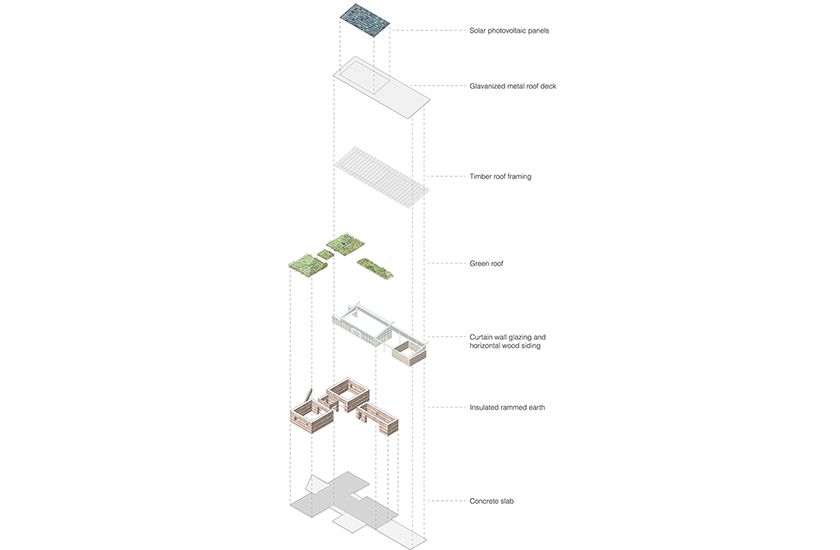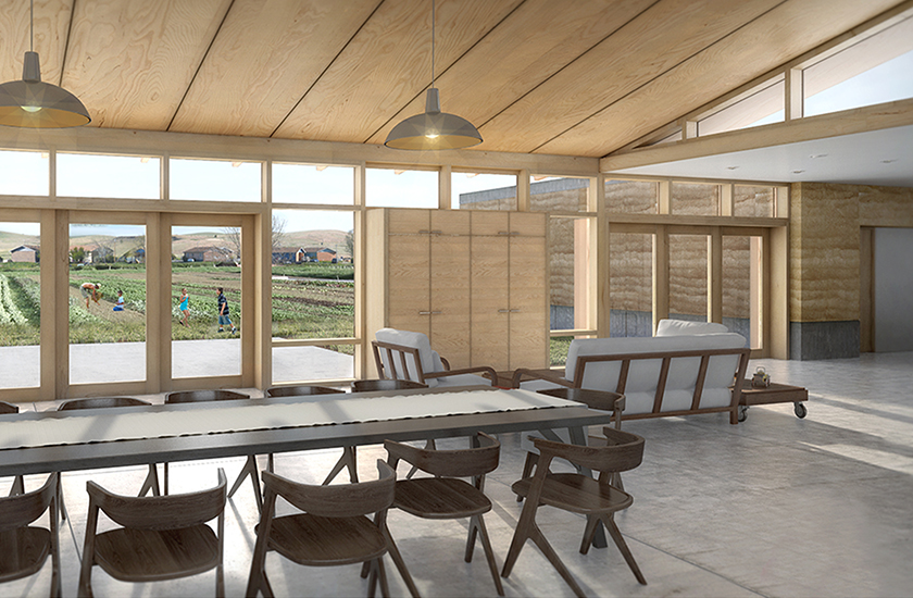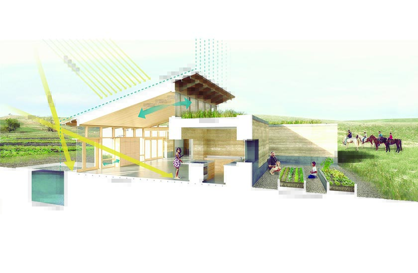 Severe winters and hot summers characterize the extreme climate on Pine Ridge. The Emergency Youth Shelter is designed to maximize it’s passive and active solar potential by leveraging the thermal mass of the rammed earth walls to keep the building warm in the winter and cool in the summer. Rainwater will be collected and utilized in the landscaping.